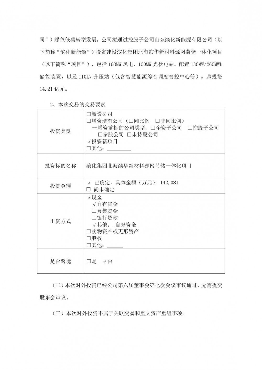 公告指出,公司拟通过控股子公司山东滨化新能源有限公司(简称“滨化新能源”)投资建设滨化集团北海滨华新材料源网荷储一体化项目。