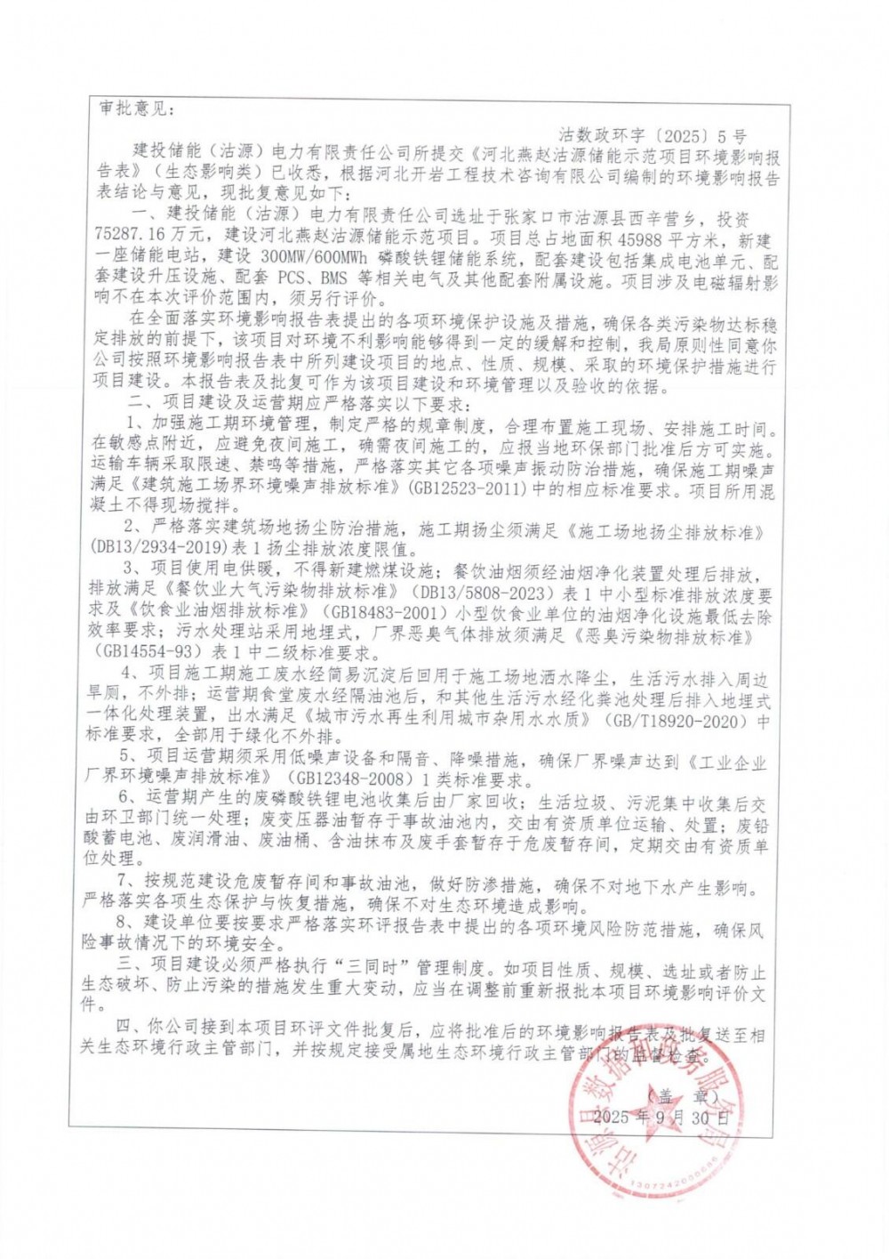 关于建投储能(沽源)电力有限责任公司河北燕赵沽源储能示范项目建设项目环境影响报告表的审批决定公告
