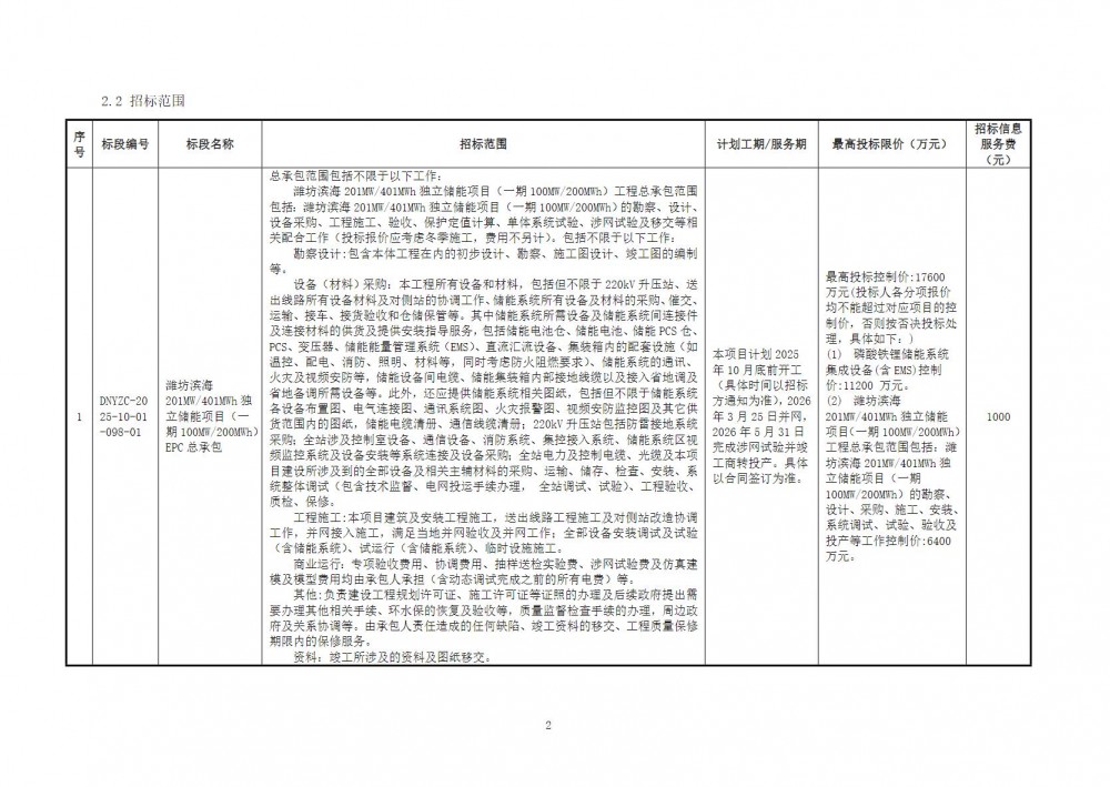 总承包范围包括不限于以下工作:潍坊滨海201MW/401MWh独立储能项目(一期100MW/200MWh)工程总承包范围包括:潍坊滨海201MW/401MWh独立储能项目(一期100MW/200MWh)的勘察、设计、设备采购、工程施工、验收、保护定值计算、单体系统试验、涉网试验及移交等相关配合工作(投标报价应考虑冬季施工,费用不另计)。